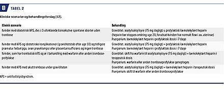 Kvinder, der har haft sene graviditetstab, og kvinder med trombotisk APS (dvs. kvinder, der tidligere har haft arterielle eller venøse tromboser) behandles med acetylsalicylsyre og LMWH i forskellig dosering under graviditeten [10, 15] (Tabel 2).