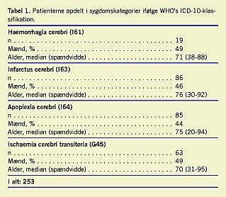 Data på patienter i det tidligere Vejle Amt blev indhentet fra den elektroniske database (Det Grønne System) på Vejle Sygehus ved søgning efter International Sygdomsklassifikation (ICD-10) [8]. Undersøgelsen inkluderede patienter indlagt på Vejle, Kolding, Fredericia eller Horsens Sygehus i perioden fra den 1. oktober 2003 til den 31. december 2003 med sygdomskoderne: I61 (haemorrhagia cerebri; dansk: hjerneblødning); I63 (infarctus cerebri; dansk: hjerneinfarkt); I64 (apoplexia cerebri; dansk: slagtilfælde); G45 (ischaemia cerebri transitoria; dansk: transitorisk cerebral iskæmi. Patienter fra andre amter og patienter med ikkedansk cpr-nummer blev ekskluderet fra undersøgelsen.