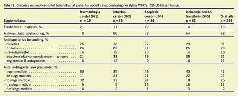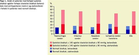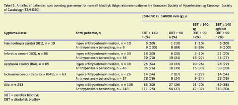 Resultater: Medianalderen var 74 år med ligelig kønsfordeling. I alt 13% af patienterne havde diabetes mellitus. I alt 74% af patienterne havde hypertension før indlæggelsen. Af disse var 59% i antihypertensiv behandling, og af disse havde 80% BT ≥ 140/90. De resterende 41% af alle fik ingen antihypertensiv behandling, selvom 66% af disse patienter havde forhøjet BT.