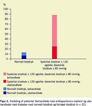 I alt 59% af samtlige patienter var i antihypertensiv behandling på indlæggelsestidspunktet. Tre fjerdedele af patienterne i antihypertensiv behandling havde forhøjet BT (Tabel 3 og Figur 1 ). Ifølge danske rekommandationer og American Diabetes Association (ADA) bør SBT/DBT hos diabetikere ikke overstige 129/79 mm Hg [10, 11]. Dette krav overholder kun 13% af de 32 patienter med diabetes. Endvidere oversteg to tredjedele af diabetespatienterne denne grænse, på trods af at de modtog antihypertensiv behandling (Figur 2 ). Blandt de 87% diabetespatienter med forhøjet BT lå blodtryksmålingen hos en fjerdedel af disse patienter lige netop på 130 for SBT og/eller 80 for DBT.