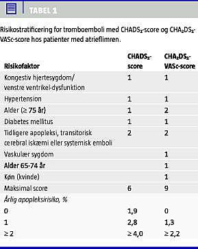 Med CHA2 DS2 -VASc-score kan man stratificere den tromboemboliske risiko hos patienter med AFLI ud fra samme parametre som med den tidligere anvendte CHADS2 -score, men alder tillægges større værdi, og vaskulær sygdom, alder 65-74 år samt køn tilføjes vurderingen (Tabel 1 ). Herved opnås der bedre identifikation af patienter, der har lav tromboembolisk risiko uden behov for antitrombotisk behandling.