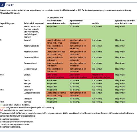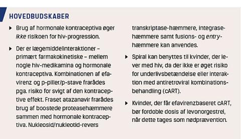 Da risikoen for hiv-smitte efter seksuel eksposition er forsvindende lille, hvis personen, der lever med hiv, er velbehandlet, er rekommandationen om kondombrug for at forebygge hiv-transmission frafaldet [7]. Dette, den hyppige forekomst af ikkeplanlagte graviditeter og muligheden for interaktioner mellem cART og hormonale kontraceptiva (HC) bør lede til bedre rådgivning om svangerskabsforebyggende midler til kvinder, der lever med hiv. Formålet med denne artikel er at redegøre for interaktioner mellem cART og HC.