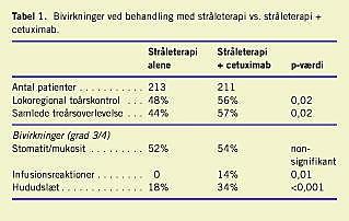 Tidlige kliniske forsøg har generelt givet optimistiske re-sultater. Bivirkningerne af behandlingen er beskedne og stammer primært fra de overfladevæv, der har en naturlig forekomst af EGFr. Det betyder, at udslæt, slimhindeirritation og diare har været fremtrædende. Det første randomiserede fase III-studie med kombineret strålebehandling og EGFr-antistoffet cetuximab blev præsenteret på sidste års møde i American Society of Clinical Oncology (ASCO) og senere på året i European Society of Therapeutic Radiation Oncology (ESTRO). I alt 424 patienter med hoved-hals-cancer blev randomiseret til kurativt intenderet strålebehandling alene eller strålebehandling i kombination med cetuximab. Data er endnu præliminære, men både lokoregional kontrol og total overlevelse var signifikant bedre i gruppen, som fik både cetuximab og stråleterapi. Således blev den toårs lokoregionale kontrol øget fra 48% til 56%, og den samlede treårsoverlevelse steg fra 44% til 57%. Bivirkningerne er rapporteret som værende beskedne i forhold til stråleterapi alene, med forbigående hudproblemer i form af udslæt som det væsentligste (Tabel 1).