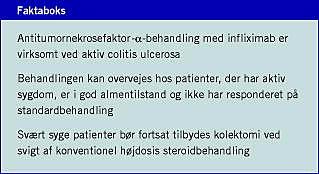 Summary Anti-TNF-α antibody treatment of patients with active ulcerative colitis Ugeskr Læger 2007;169(9):789-91 Recently published studies have demonstrated that infliximab is effective not only in Crohn's disease, but also in ulcerative colitis. The present article reviews current treatment options for severe ulcerative colitis as well as available data on the effect of infliximab in the treatment of this disease. The article discusses the possible future role of infliximab in the treatment of ulcerative colitis.