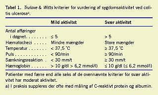 Patienter med svært aktiv ulcerøs kolitis, defineret ud fra True-love & Witts klassiske kriterier (Tabel 1 ) [3], vil i praksis have ekstensiv kolitis (medinddragende højre fleksur) eller regelret pankolitis og bør indlægges akut til højdosis steroidbehandling, sædvanligvis prednisolon 1 mg/kg/dag per os. Parenteral administration (f.eks. intravenøs injektion med hydrocortison 100 mg × 4) er normalt kun indiceret, hvis patienten ikke kan indtage peroral medicin. Allerede i den akutte fase kan der suppleres med peroral (2,4-4,0 g/dag) og rektal (1-2 g/dag) mesalazin. Såfremt patienten er ernæringsmæssigt truet, gives der parenteral ernæring, men rutinemæssig parenteral ernæring er uden effekt på grundsygdommen og bør derfor ikke anvendes. Det samme gælder som hovedregel for antibiotisk behandling, herunder behandling med ciprofloxacin [4]. Patienten bør i samarbejde med en kirurgisk gastroenterolog observeres tæt med daglig eller hyppigere reevaluering af tilstanden. Ved manglende effekt af den ovenfor anførte behandling må yderligere medicinsk behandling (se nedenfor) eller kolektomi overvejes.