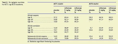 Modsat resultaterne ved Crohns sygdom har resultaterne af de første prospektive, blindede, placebokontrollerede studier af effekten af infliximab ved moderat til svær steroidrefraktær ulcerøs kolitis ikke været entydigt positive. Det første lille kontrollerede studie (11 patienter) [6] fra 2001 tydede på en effekt af infliximab, mens to efterfølgende, lidt større studier (43 og 45 patienter) viste henholdsvis ingen effekt [7] og en klar statistisk signifikant effekt [8]. Forskellen i de to sidstnævnte studiers resultater kan skyldes forskelle i studiepopulationerne, men også forskellige primære behandlingsmål (endpoints ). Det er bemærkelsesværdigt, at i studiet, der viste en effekt [8], var denne kun til stede i de moderat til svære tilfælde (0% kolektomerede i infliximabgruppen mod 62,5% kolektomerede i placebogruppen), mens effekten ved de fulminante tilfælde ikke var statistisk signifikant (kolektomirater på henholdsvis 47% og 69%). For nylig er resultaterne af yderligere to prospektive, randomiserede, placebokontrollerede studier af infliximabs effekt ved moderat til svær ulcerøs kolitis blevet offentliggjort [2]. Disse studier (ACT1 og ACT2), som fraset forskel i varighed (ACT1: 54 uger, ACT2: 28 uger) samt minimale forskelle i inklusionskriterier havde samme design og omfattede hver 364 patienter med moderat til svær ulcerøs kolitis på trods af behandling med steroid (alene eller i kombination med azathioprin/6-mercaptopurin og/eller 5-aminosalicylater). Kun ca. en tredjedel af de inkluderede patienter var dog egentlig steroidrefraktære (bedømt ud fra manglende respons på minimum 40 mg prednisolon givet peroralt i to uger eller intravenøst i minimum en uge). Infliximab (5 mg/kg eller 10 mg/kg givet intravenøst uge 0, 2 og 6 og herefter hver ottende uge) gav signifikant højere remissions- og responsrater (Tabel 2 ) end placebo. Efter otte ugers behandling var responsraten blandt de infliximabbehandlede på 60-70% og på 30-40% i placebogruppen. Remissionsraterne var 28-39% og 6-16% for henholdsvis infliximab- og placebogruppen. Efter 52 ugers behandling var respons- og remissionsraterne faldet til henholdsvis ca. 45% og ca. 34% i infliximabgruppen, mens de tilsvarende rater i placebogruppen var henholdsvis 20% og 17%. Forskellen mellem placebo og begge doser infliximab var statistisk signifikant otte, 30 og 54 (kun ACT1) uger efter initiering af behandlingen. Effekten af infliximab var sammenlignelig (og signifikant) i såvel gruppen af steroidrefraktærer patienter som i gruppen af nonsteroidrefraktærer patienter. Der sås ingen betydende forskel mellem de to doser infliximab. Det mere klinisk relevante mål, nemlig vedvarende klinisk respons fastholdt ved alle målepunkter, blev opnået af 40-50% af de patienter, der blev behandlet med infliximab, sammenlignet med 15-20% i placebogruppen. De tilsvarende tal for vedvarende remission var mindre overbevisende: 15-25% for infliximab mod 2-8% for placebo.