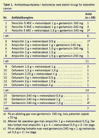 Materiale og metoder: Der blev i 2004 udsendt et spørgeskema vedrørende den antibiotiske profylakse (AP) og postoperative antibiotikabehandling i forbindelse med elektiv operation for kolorektal cancer og akut kolorektal kirurgi. Spørgeskemaet blev udsendt til alle 39 kirurgiske afdelinger i Danmark, hvor der på daværende tidspunkt blev foretaget kolorektale kirurgiske indgreb.
