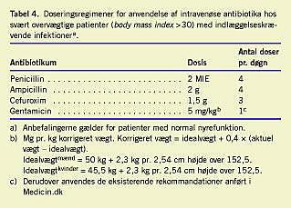 Postoperative infektioner forekommer hyppigere hos overvægtige end hos normalvægtige. En større dosis af antibiotika hos overvægtige kan nedsætte antallet af postoperative sårinfektioner [20]. Kun på tre afdelinger gav man højere dosis til overvægtige patienter. For svært overvægtige personer med BMI større end 30 og normal nyrefunktion kan dosisøgning overvejes (Tabel 4 ). Gentamicin bør doseres efter patientens korrigerede vægt (Tabel 4). Der findes ingen studier vedrørende metronidazol og overvægt [19].