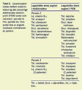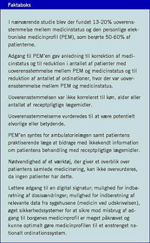 Resultater: Studiet viste en 13-20% uoverensstemmelse mellem medicinstatus og PEM, hvilket berørte 50-60% af patienterne. Adgang til PEM'en gav anledning til korrektion af medicinstatus og til reduktion i antallet af patienter med uoverensstemmelse mellem PEM og medicinstatus og til reduktion af antallet af ordinationer, hvor der var uoverensstemmelse mellem PEM og medicinstatus. Uoverensstemmelserne var ikke korreleret til køn, alder eller antallet af receptpligtige lægemidler. Mange af uoverensstemmelserne vurderedes til at være potentielt alvorlige eller betydende.