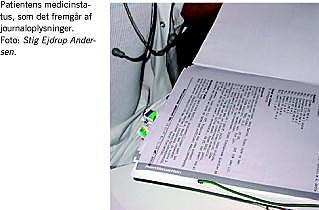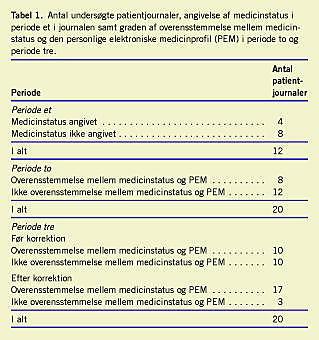 I dette studie indgik patienter, der i tre perioder - 14 dage i december 2005 og to gange 14 dage i marts 2006 - besøgte et geriatrisk hospitalsambulatorium. En projektlæge fik delegeret adgang til patienternes PEM i projektperioden. Periodetidspunkter og periodelængde blev dikteret af de deltagende ambulatorielægers tilstedeværelse. Ambulatorielægerne inkluderede alle patienter, hvor det i perioden var praktisk muligt. I den første periode havde ambulatorielægen ikke adgang til PEM. Perioden afspejlede »vanlig praksis« og kunne derfor anvendes til at se, hvor ofte medicinstatus blev noteret i journalen. I anden periode blev ambulatorielægen bedt om at notere medicinstatus i journalen, men havde ikke adgang til patientens PEM, hvilket alene projektlægen havde. I tredje periode havde ambulatorielægen via projektlægen adgang til oplysninger fra PEM'en. Antal undersøgte patientjournaler, angivelse af medicinstatus i periode et i journalen samt graden af overensstemmelse mellem medicinstatus og PEM i periode to og tre er anført i Tabel 1.