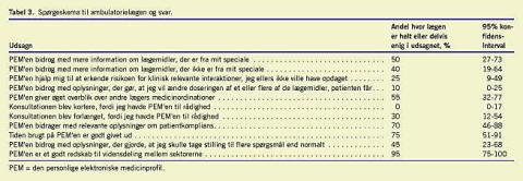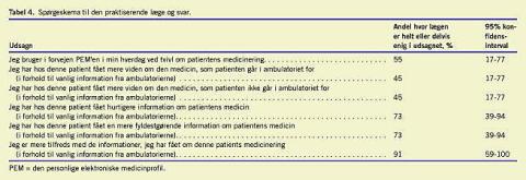 Resultatet af spørgeskemaundersøgelserne viste, at PEM'en for ambulatorielægen bidrog med ikkeerkendt eller mere fyldestgørende information om patientens behandling med receptpligtige lægemidler samt med relevante oplysninger om patientkomplians, at tiden brugt på PEM'en var godt givet ud, og at PEM'en syntes at være et godt redskab til vidensdeling mellem sektorerne (Tabel 3). Endvidere viste spørgeskemaundersøgelserne, at patientens praktiserende læge fik mere viden og mere fyldestgørende information om patientens behandling med receptpligtige lægemidler, når ambulatorielægen havde PEM'en til rådighed (Tabel 4).