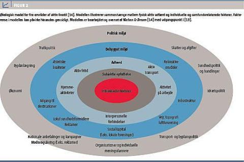 I et socioøkologisk perspektiv er det centralt at inddrage flere forskellige niveauer: individ-, familie- og organisationsniveau samt lokalsamfund, sociale fællesskaber og hele befolkningen for at forstå forskellige former for trivsel [10]. Sygdom, sundhed og trivsel må således anskues som dynamiske processer, der i høj grad formes i det sociale liv. I relation hertil bliver det afgørende, at der tages udgangspunkt i den sociale kontekst, som påvirker trivsel og konkret sundhedsadfærd [3, 11, 12]. I Figur 2 suppleres det flerstrengede perspektiv med en mere detaljeret beskrivelse af de forskellige niveauer, som indgår i en socioøkologisk model [13, 14].