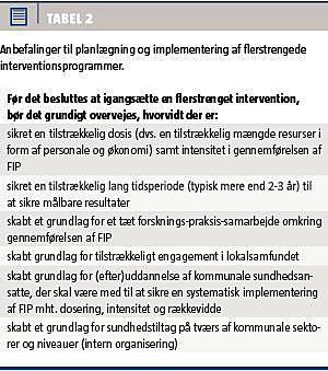 Med de store udfordringer, som kommunerne efter Strukturreformen i 2007 [23] har fået ansvaret for at løse inden for forebyggelse og sundhedsfremme, synes vi, at der er et stort behov for at gå nye veje for at kunne medvirke til at reducere sundhedsproblemer i f.eks. udsatte befolkningsgrupper. Meget tyder på, at det ikke nytter blot at fortsætte med i kommunerne at igangsætte mindre enkeltprojekter, der oftest ikke udviser nogen målbare effekter, og som samlet set kan opfattes som en uhensigtsmæssig måde at anvende midler til forebyggelse på [15]. Med introduktionen til FIP har vi foreslået en fremadrettet model, hvormed man har opnået gode resultater i udlandet, men som kræver en række overvejelser og stillingtagen (Tabel 2), før den kan bruges i en dansk kontekst.