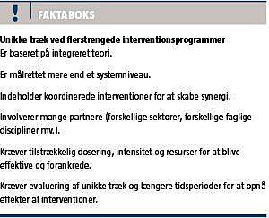 Formålet med denne artikel er på baggrund af viden og erfaringer fra den internationale forskning på området at introducere flerstrengede interventionsprogrammer (FIP) og kort diskutere deres relevans for lokale sundhedsfremmeinterventioner i en dansk kontekst.