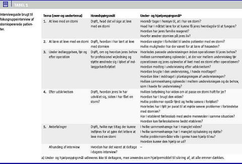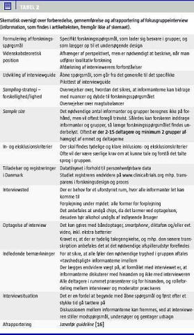 Som forberedelse til et fokusgruppeinterview udarbejdes der en interviewguide, som belyser forskningsspørgsmålet (se Tabel 1 for eksempel på en interviewguide). Interviewguiden er udarbejdet på baggrund af den foreliggende litteratur og viden om emnet. Ved gennemførelse af fokusgruppeinterview bør intervieweren besidde en vis grad af fortrolighed med det emne, som drøftes. I modsat fald kan det være vanskeligt at bevare overblikket og forholde sig dynamisk til samtalens udvikling, ligesom det kan betyde, at informanterne mister tiltroen til intervieweren. Dernæst må intervieweren ikke mindst have forståelse for og gerne erfaring med ledelse af gruppeprocesser [13], dels for at kunne anerkende den enkelte informants input, dels for at kunne inddrage alle informanter i diskussionen [13]. Intervieweren skal på den ene side være tilstrækkeligt involveret i gruppen for at kunne facilitere processen, men skal på den anden side ikke være så dominerende, at processen eller diskussionen bliver hæmmet [3]. Eksempelvis kan intervieweren ved at forholde sig passivt opleve, at informanterne tager ordet og bliver motiverede til at uddybe og nuancere deres udtalelser.