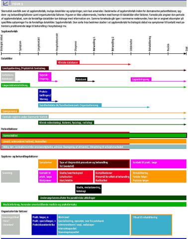 Forløbet fra en patient bliver syg og kommer i behandling, til vedkommende er helbredt eller dør, er ofte komplekst og omfatter en række trin, der hver for sig kan påvirkes af forskellige faktorer med relation til den enkelte patient, selve sygdommen, behandlingen og dennes organisering. For eksempel kan patientens køn, alder, komorbiditet, socioøkonomiske status og komplians have betydning for, hvor hurtigt vedkommende får stillet en kræftdiagnose og dermed have afgørende betydning for, hvilket sygdomsstadie patienten har på diagnosetidspunktet [1, 2]. De samme faktorer vil ofte også have en effekt på udbyttet af behandlingen og prognosen. Endvidere er der voksende evidens for, at behandlingssystemets organisering og specialisering har betydning for kvaliteten af diagnostik, behandling og pleje og for risikoen for komplikationer, recidiv og død [3-7].