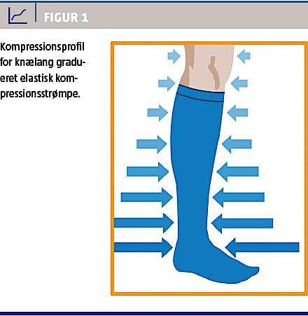 Kompressionsstrømper anvendes ved behandling af venøs insufficiens, herunder især venøs insufficiens pga. DVT. Kompressionsstrømper (Figur 1) er lægeordinerede, forudsætter professionel måltagning og findes med forskellige kompressionsstyrker angivet med ankeltryk i mmHg. Hyppigt opdeles kompressionsstrømper i klasser (I-IV) ud fra deres styrke, men da ankeltrykket ved klasse I-IV i USA og Europa ikke stemmer overens [3], bør behandlingsanbefalinger angives med ankeltryk og ikke klasse.