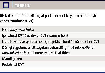 10% [2] (Figur 2). De fleste tilfælde opstår inden for de første to år efter den akutte DVT [4]. Det er p.t. ikke muligt at identificere, hos hvilke patienter med DVT der vil udvikles PTS, om end der er flere kendte risikofaktorer [5, 6], som sundhedsprofessionelle bør tage højde for (Tabel 1). Behandling af PTS er udfordrende, hvorfor det er vigtigt at være opmærksom på effektiv forebyggelse.