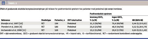 Anvendelse af knælang gradueret elastisk kompressionsstrømpe med et ankeltryk på 30-40 mmHg [9, 10] reducerer risikoen for udvikling af PTS med 50% hos patienter med nydiagnostiseret symptomgivende proksimal DVT [9, 10] (Tabel 2). Risikoen for udvikling af svært PTS reduceres ligeledes med 50%. Kompressionsstrømper med lavere ankeltryk (26,3-36,1 mmHg) har ikke vist signifikant effekt [11].