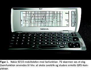 Den kardiologiske bagvagt bærer konstant en Nokia 9210-mobiltelefon med indbygget farveskærm med en opløsning på 640 × 200 pixels (Figur 1 ). Telefonen er tidligere blevet afprøvet, hvor man ikke fandt forskelle på kardiologers kliniske beslutningstagning i forhold til eventuel revaskulariserende behandling, når ekg blev bedømt ud fra henholdsvis papir-ekg og telefonens skærm [5]. Til telefonen er der knyttet et normalt telefonabonnement og et separat faxnummer. På grund af en indbygget mikrofon og højttaler kan man tale i telefonen, samtidig med at man studerer skærmen. Signaler transmitteres via det almindelige mobiltelefonnet.