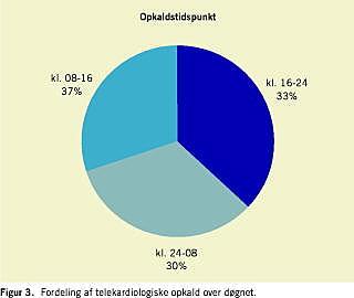 Resultater: Der blev foretaget 378 opkald til mobiltelefonen - i gennemsnit ét pr. dag. Opkaldene var jævnt fordelt over døgnet med 37% i tidsrummet fra kl. 08 til kl. 16, 33% fandt sted mellem kl. 16 og kl. 24, og 30% fandt sted mellem kl. 24 og kl. 08. Opkaldene drejede sig primært om STEMI (64%), mens 34% drejede sig om mere almene kardiologiske problemstillinger. Responstiden var lav. I 92% af tilfældene modtog primærsygehuset svar inden for 5 min. I 45 tilfælde (12%) blev der registreret tekniske problemer, som i 15 tilfælde (4%) skyldtes problemer med selve mobiltelefonen.