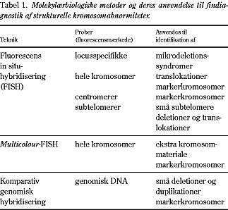 I dag råder man over en række molekylærbiologiske metoder, som isoleret eller kombineret kan anvendes til at identificere selv meget små og komplicerede strukturelle kromosomabnormiteter. Metoderne er baseret på FISH, hvor en fluorokrommærket probe med en given DNA-sekvens hybridiseres til en komplementær DNA-sekvens på et kromosompræparat. Herved kan den pågældende DNA-sekvens identificeres på præparatet (2). I Tabel 1 gives en oversigt over de hyppigst benyttede FISH-metoder og deres væsentligste anvendelsesområder. Locusspecifikke prober kan benyttes til påvisning af kendte mikrodeletionssyndromer, f.eks. Prader-Willis og DiGeorges syndromer. Prober, som farver et enkelt kromosom (såkaldte maleprober), er velegnet til at påvise translokationer og markerkromosomer. Centromerprober benyttes til at identificere markerkromosomer. Subtelomerprober anvendes til påvisning af små subtelomere deletioner og translokationer. Ved multicolour -FISH, hvor proben består af alle 24 kromosomtyper hver med sin farve, kan man identificere ekstra kromosommateriale af ukendt oprindelse, f.eks. markerkromosomer. Komparativ genomisk hybridisering (CGH) er velegnet til identifikation af markerkromosomer og submikroskopiske deletioner og duplikationer, der ikke kan ses ved almindelig kromosomundersøgelse (4). Med de anførte metoder kan de fleste strukturelle abnormiteter identificeres prænatalt med stor sikkerhed. Fig. 1 viser konkrete eksempler herpå. Detaljer er beskrevet i figurteksten. I Fig. 1A benyttes en locusspecifik probe til at bekræftes diagnosen DiGeorges syndrom hos et foster, hvor UL-scanning har givet formodning herom. I Fig. 1B viser man ved en FISH-undersøgelse, at en gravid kvinde er bærer af en balanceret t(21q;22q), som ikke kan ses ved almindelig kromosomundersøgelse. Hendes første barn har en ganske lille ubalanceret t(21q;22q), som i forvejen er påvist ved en CGH-undersøgelse (ikke vist). Fig. 1C viser FISH-undersøgelse af en moderkageprøve fra den gravide translokationsbærer. Der er anvendt subtelomerprober for kromosom 21 og 22, som viser, at fosteret har en ubalanceret t(21q;22q). Dette bekræftes ved CGH-undersøgelse i Fig. 1D.
