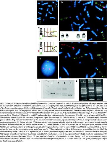 Fig. 1E viser hurtig diagnostik af trisomi 21, Downs syndrom, i udyrkede interfaseceller ved hjælp af locusspecifikke prober. For nylig er en billigere PCR-baseret teknik blevet introduceret som alternativ til FISH-teknikken. Den er baseret på højpolymorfe DNA-markører. De fleste mennesker har to forskellige alleler for disse markører. Har et menneske f.eks. to kromosomer nr. 21, vil kvantitativ fluorescens PCR (QF-PCR) vise to alleler med samme intensitet, repræsenteret ved et kromatogram med to toppe med samme højde. Er der tre kromosomer nr. 21, finder man tre alleler (toppe) af ens højde eller to toppe, hvor den ene er dobbelt så stor som den anden, hvis to af de tre kromosom 21 er identiske for den pågældende markør. Teknikken er taget i rutinemæssig anvendelse flere steder i udlandet og er under indkøring herhjemme (5). Det forventes, at metoden for en mindre merpris vil kunne tilbydes som supplement til den konventionelle kromosomundersøgelse for at opnå et hurtigt svar på de hyppigst forekommende kromosomabnormiteter.