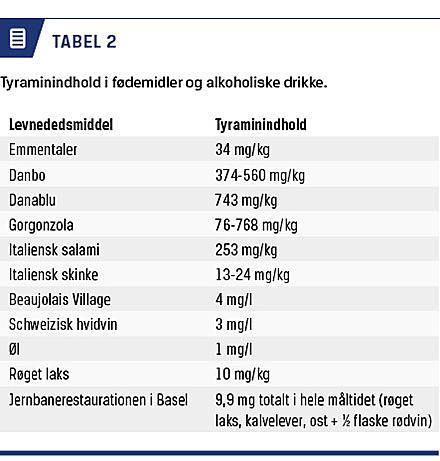 klinisk relevant blodtryksstigning. For isocarboxazids vedkommende er man på den sikre side, hvis tyraminmængden begrænses til anslået maks. 10-15 mg. Mindst tåles, når marplandosis er høj. Man bør holde sig til helt friske fødemidler og dertil have kendskab til, hvilke fødemidler der har et specielt højt tyraminindhold. Tyraminindholdet er analyseret i en række europæiske fødemidler og restaurationsmenuer (Tabel 2). Først og fremmest er det risikabelt at spise lagret ost, især blåskimmelost, hvorimod rødvin, som der historisk set er advaret imod, skal indtages i betydelige mængder, før der er risiko for alvorlig interaktion [29].