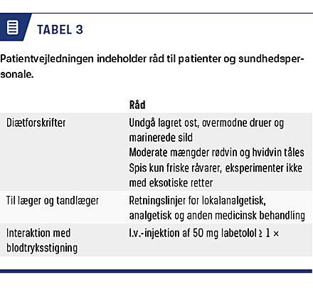 grunden for potentielle interaktioner med visse andre farmaka og visse fødemidler har gjort det muligt for specialister at gennemføre antidepressiv behandling med isocarboxazid rationelt og risikofrit. Enkle retningslinjer for behandlingen fremgår af en isocarboxazidpatientvejledning, som enhver patient i behandling med isocarboxazid bør udstyres med. Af denne fremgår det, hvilken anden medicin patienten ikke kan indtage sammen med isocarboxazid, og hvilke diætforskrifter som skal overholdes (Tabel 3).