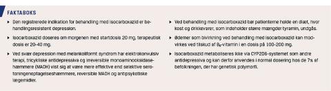 The antidepressant efficacy of isocarboxazide is well esta­blished; however, the clinical use early became restricted and today the use of isocarboxazide in Denmark is very limited. Isocarboxazide is safe when keeping a low tyra­mine-containing diet and avoiding concomitant treatment with certain drugs. The risk of developing oedema can be reduced by vitamin B6 treatment. Normal dosage isocar­bo­xazide may be prescribed for all patients because isocarbo­xazide is not metabolized through the CYP2D6 enzyme complex like most other antidepressants. It is recommended to include isocarboxazide in the official treatment algorithms for patients who are resistant to conventional antidepres­sant therapy and electroconvulsive therapy.