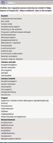 MR-skanning er en integreret del af udredningen af neurologiske lidelser. Cerebrum og medulla er ideelle objekter for MR-skanning. Her er nemlig et lille volumen uden bevægelse og med en lille afstand fra parenkymet til den antenne (spole), som måler signalet fra brintkernerne. Det samme gælder led og ekstremitetslidelser. MR-skanning er da også i dag en primær undersøgelse ved elektiv udredning af lidelser i centralnervesystemet (f.eks. dissemineret sklerose, infarkter, tumorer, infektion og vaskulære malformationer) og bevægeapparatet ved sygdomme i bløddele (f.eks. menisklæsioner, betændelser, diskusprolaps, muskel- og senelæsioner og leddegigt), og hvor der klinisk er mistanke om knoglebrud trods normalt røntgenbillede (f.eks. scaphoideumfrakturer og hoftefrakturer). Også til påvisning af knogle- og bløddelstumorer og -metastaser anvendes MR-skanning. En henvisning til MR-skanning af ryggen hos en patient med kendt kræft må sendes på vag mistanke om spredning, så man sikrer sig, at der ikke foreligger tværsnit eller truende tværsnit (Figur 1). Ved hjælp af helkrops-MR-skanning er det muligt at få et hurtigt overblik over både bløddels- og knoglemetastaser. Metoden bruges rutinemæssigt ved monitorering af behandlingen af nogle patienter med kræft. MR-skanning har erstattet CT i væsentlig grad, når det gælder elektive undersøgelser af centralnervesystemet og det muskuloskeletale system (Tabel 1), mens CT er klart dominerende, når det gælder akutte undersøgelser, bortset fra når man har mistanke om metastasebaseret tværsnit i ryggen. ###1212073601###