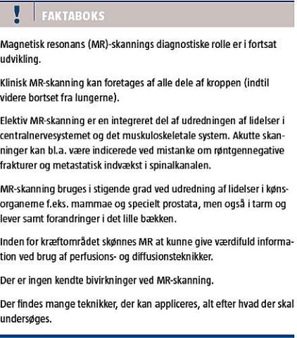 Magnetisk resonans (MR)-skanning har været brugt til klinisk diagnostik i Danmark siden 1984. I 2009 blev der foretaget ca. 250.000 skanninger, og tallet er fortsat stigende. Billeddannelsen sker ud fra patientens brintkerner [1], som primært findes i vand og fedt. Fordelen ved MR-skanning er, at der sker bløddelsbilleddannelse uden brug af ioniserende stråling. Ulempen er tidsforbruget. En komplet undersøgelse består af flere forskellige billedserier (sekvenser) og tager 20-60 min.