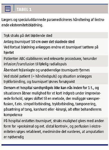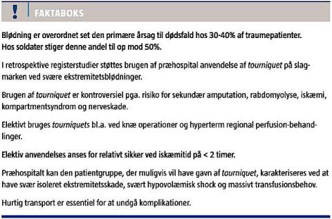 De seneste årtiers engagement i Afghanistan og Irak og erkendelsen af, at blødning er den primære dødsårsag blandt faldne soldater [1], har ført til en række tiltag med sigte på at øge overlevelsen. Dels ved at begrænse blødning mest muligt på skadestedet, dels ved at optimere patientens mulighed for overlevelse ved hurtig transport til de primære behandlingsfaciliteter. Ud af 4.596 krigsdræbte soldater i Irak og Afghanistan døde 87,3%, inden de nåede et medical treatment facility [1]. I 50% af tilfældene blev blødning vurderet som værende den primære dødsårsag [2]. Et af tiltagene for at øge overlevelsen har været implementering af tourniquet som en del af standardudrustningen til soldaterne. Amerikanske soldater, der var udsendt til Afghanistan, er siden 2005 blevet trænet i anvendelse af og udstyret med tourniquet – Combat Application Tourniquet (C-A-T), hvilket også er gældende for danske soldater. Denne artikel har til formål at beskrive de militære erfaringer med anvendelse af tourniquet præhospitalt og at diskutere dets anvendelse i det civile præhospitale miljø.