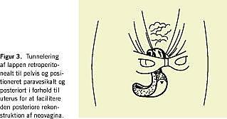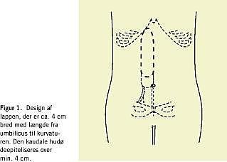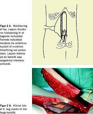 Inferior stilket VRAM-lap er tidligere detaljeret beskrevet [8, 9]. Der rejses en højresidig inferior stilket VRAM-lap med en tilhørende supraumbilikal hudø. Hudøen er typisk 4 cm bred med længde fra umbilicus til kurvatur. Den kaudale del af hudøen deepiteliseres over min. 4 cm (Figur 1 ). Lappen frigøres fra bagerste rectusblad, og forreste rectusblad incideres proksimalt fra umbillicus til insertionen distal på ossis pecten pubis. Lappen isoleres på sin kar stilk vasa epigastrica inferiores profunda til afgangen fra vasa iliaca internae (Figur 2 ). Distalt gennemskæres rectusmusklen lateralt, således at ca. 1 cm af musklen fortsat hæfter på ossis pecten pubis. Denne modifikation i den operative teknik synes at sikre karstilken mod torsion eller uhensigtsmæssig tension i forbindelse med transponering af lappen. Lappen tunneleres retroperitonealt og paravesikalt til pelvis og hos kvinder posteriort for uterus for at facilitere den posteriore vaginale rekonstruktion (Figur 3 ). Den voluminøse muskulokutane lap positioneres således, at bækkendefekten udfyldes bedst muligt ( Figur 4 ). To sugedræn anlægges i perineum og transabdominalt. Blæren aflastes med et suprapubisk kateter. Det postoperative regimen omfatter immobilisering i ti dag i rygleje, let abduceret hofte og underekstremiteter på dyne. Gradvis mobilisering herefter. Tilladelse til at sidde efter to uger. Abdominal suspensionsbælte anvendes 3 mdr. postoperativt.