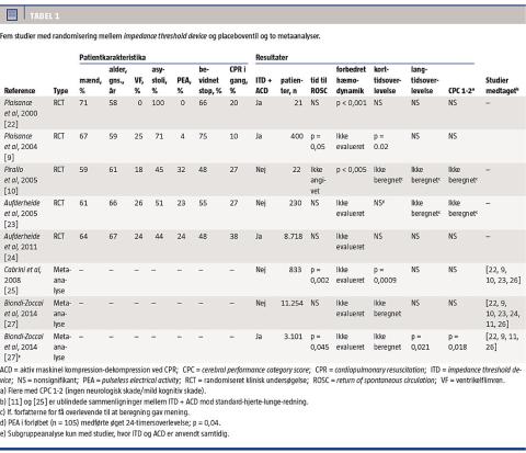 Alle fem randomiserede undersøgelser omhandlede præhospitale hjertestop, de var dobbeltblindede, og man havde benyttet en inaktiv placebo-ITD vs. en aktiv ITD.