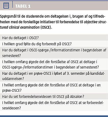 Efter afholdelsen af OSCE udsendte den centrale evalueringsenhed ved Det Sundhedsvidenskabelige Fakultet et spørgeskema for at vurdere deltagelsen, brugen og tilfredsheden ved de forskellige forberedende initiativer (Tabel 1). Deltagelsen og brugen blev vurderet ved ja-/nejsvar, mens studerendes tilfredshed og forberedelsesgrad blev vurderet på en Likertskala, der gik fra 1 til 7, med 1 for meget utilfreds/meget lidt og 7 for meget tilfreds/meget højt som endepunkter.