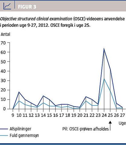 Informationsforelæsningen blev vurderet til 4 (IQR: 3-5), OSCE-videoen til 4 (IQR: 4-6) og prøve-OSCE til 6 (IQR: 5-7) (Figur 2). Prøve-OSCE blev vurderet signifikant højere end både informationsforelæsningen og OSCE-videoen (p < 0,001, Kruskal-Wallis test; p < 0,001, Mann-Whitney U-test mellem forelæsning og prøve-OSCE; p < 0,001, Mann-Whitney U-test mellem OSCE-video og prøve-OSCE; p = 0,295, Mann-Whitney U-test mellem forelæsning og OSCE-video). Videoen blev afspillet i løbet af hele semesteret, men mest i løbet af de sidste to uger inden afholdelsen af OSCE i juni 2012, hvor videoen blev afspillet 105 gange og set helt igennem 51 gange (Figur 3).