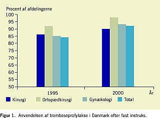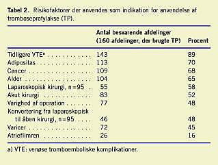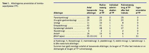 Resultater: Svarprocenten var 95. TP anvendtes rutinemæssigt på 96% af de afdelinger, der udførte større kirurgi, heraf administrerede 92% TP efter faste retningslinjer. Kun på 43% af afdelingerne benyttedes TP ved akut kirurgi. Alle afdelinger brugte lavmolekylært heparin som TP. ASA blev praktisk taget ikke benyttet som venøs TP længere. Langtidstromboseprofylakse har endnu ikke vundet indpas i Danmark, idet man kun på ni afdelinger i Danmark gav TP i mere end 14 dage.