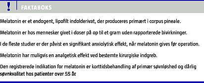 Baseret på den tilgængelige litteratur er der dokumentation for, at melatonin har anxiolytisk, sedativ og muligvis analgetisk effekt ved kirurgi. Melatonin er et sikkert stof, der i gramdoser har været uden bivirkninger hos mennesker [11]. I samtlige studier, hvor melatonins anxiolytiske, analgetiske og sedative effekter har været undersøgt, har bivirkningerne ikke været signifikant forskellige fra dem, der sås ved placebo [1-10].