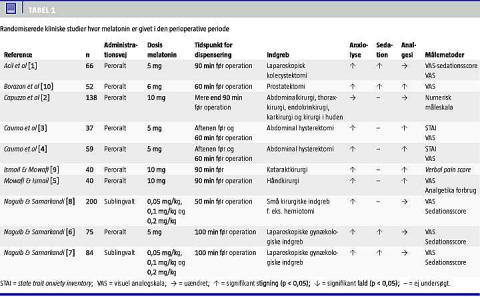 Der er flere randomiserede studier, hvor anxiolyse af melatonin ved kirurgi er undersøgt. I alle studierne undtagen et havde melatonin en anxiolytisk effekt sammenlignet med placebo [1-8]. I to ud af otte studier blev melatonin givet sublingvalt (s.l.) i doser op til 0,2 mg/kg [7, 8], mens det i seks studier blev givet peroralt (p.o.) i doser op til 10 mg [1-6]. Melatonin er blevet givet indtil 50 minutter før operationen i et studie [8] og ellers givet indtil 90 minutter før eller tidligere [1-7, 9].