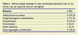 Den mikrobiologiske ætiologi til endokarditis fremgår af Tabel 2 . Absces og pseudoaneurismedannelse fandtes ved den præoperative ekkokardiografi hos 22 patienter og peroperativt hos to patienter. En paravalvulær lækage fandtes hos ti af patienterne med proteseendokarditis. Alle homografter var intakte, og de mikrobiologiske dyrkninger fra homografterne var negative. Hos otte patienter fandtes bakterier ved den peroperative mikroskopi af det fjernede væv, og bakteriedyrkningerne var positive hos tre af disse patienter. Hos to patienter var der diskrepans mellem resultatet af den direkte mikroskopi og bloddyrkningerne, men ved den efterfølgende vævsdyrkning var bakteriefundene overensstemmende.