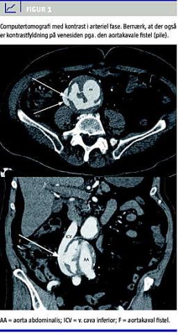 En 84-årig mand, der havde velreguleret, lettere hypertension, men i øvrigt i det væsentligste var rask, blev indlagt akut under diagnosen obs. akut koronart syndrom, da han havde haft kvalme og svære smerter i thorax og epigastriet med udstråling til ryggen. Ved ankomsten var patienten upåvirket, men to timer senere recidiverede symptomerne i svær grad, og parallelt hermed blev han akut påvirket, klamtsvedende, takypnøisk og hæmodynamisk ustabil med blodtryk på 70/40 mmHg. En elektrokardiogrammåling viste nu takykardi og ST-depression i afledninger V5-6. En akut bedside -ekkokardiografi viste normale forhold. Akut computertomografi af thorax og abdomen viste et 8 × 10 cm stort infrarenalt AAA. Dette havde en 10 mm stor fistel imellem aorta abdominalis og vena cava inferior. Det drejede om en arterie-venøs fistel med retrograd fyldning af det venøse system (Figur 1 ).