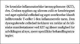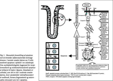 De kroniske inflammatoriske tarmsygdomme (KIT), der omfatter colitis ulcerosa (UC) og Crohns sygdom (CD), har en ukendt patogenese. Infiltration i tarmslimhinden af inflammatoriske celler og en heraf afledt produktion af inflammatoriske mediatorer (bl.a. cytokiner) spiller en væsentlig rolle for udviklingen og kroniciteten af KIT (1). Den inflammatoriske reaktion i tarmvævet har en lang række indvirkninger på de celler, der findes i slimhinden. Eksempelvis påvirkes reguleringen af celledeling og -død i høj grad af cytokiner. Ændringer i celleomsætningen af tarmmucosas forskellige celletyper har stor betydning for tarmfunktionen og kan forklare en række af de kliniske manifestationer, der ses ved KIT (2). Ved KIT er der således en øget celledød i tarmepitelet, som medfører øget tarmpermeabilitet for luminale immunogener, hvilket yderligere kan inducere celleaktivering og inflammation (3, 4). Samtidig findes der nedsat celledød blandt lymfocytter, der derved undgår den nedregulering, som normalt kendetegner inflammatoriske reaktioner (5). Begge disse forhold forklarer væsentlige sygdomsmekanismer ved KIT-patofysiologien og vil blive beskrevet i detaljer efter en forudgående kort gennemgang af de overordnede molekylærbiologiske celledødsmekanismer. De seneste års fokusering på disse mekanismer har inden for gastroenterologien været fulgt med interesse, fordi en øget forståelse af den molekylærbiologiske baggrund for cellers regulering af liv og død sandsynligvis vil vise sig at være anvendelig ved frembringelse af nye behandlingsstrategier bl.a. over for KIT.