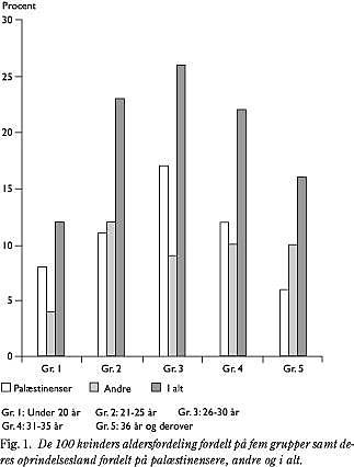 I Tabel 2 karakteriseres kvinderne i forhold til deres oprindelsesland. Lidt over halvdelen (n = 53) angav Palæstina som oprindelsesland, og de fleste af dem (n = 36) svarede, at de var kommet til Danmark via flygtningelejre i Libanon. Resten angav andre arabiske lande (Libanon, Irak, Egypten, Syrien, Tunesien, Marokko, Kuwait og Algeriet). Med hensyn til skoleuddannelse var der iøjnefaldende forskelle, idet op mod halvdelen (n = 22 eller 41,5%) af kvinderne med Palæstina som hjemland angav, at de kun havde op til seks års skolegang, mens det for kvinderne fra de andre lande kun gjaldt for 14,9%.