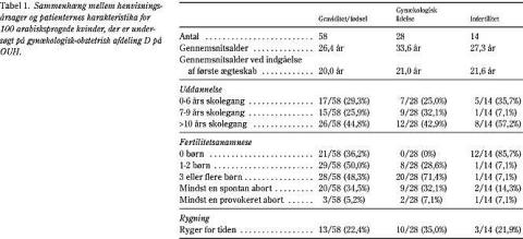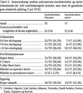 Materiale og metoder: I en seksmånedersperiode i 1998 fik alle kvinder af formodet arabisk herkomst ved henvisning til gynækologisk-obstetrisk afdeling D på Odense Universitetshospital tilbud om at deltage i undersøgelsen. Der blev udleveret et spørgeskema på arabisk til deltagerne i undersøgelsen. Til spørgeskemaet var der vedlagt en dansk oversættelse.