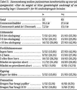 Tabel 3 omhandler kvindernes præferencer mht. lægens køn og erfaringer med hensyn til gynækologiske undersøgelser. Blandt d eltagerne angav 78, at deres egen læge var en kvinde. Nogle få (n = 15) oplyste, at de både havde en kvindelig og en mandlig læge, men når det drejede sig om gynækologiske lidelser kontaktede de den kvindelige læge. I alt svarede 32 ja til, at de havde nægtet at få fortaget en gynækologisk undersøgelse af en mandlig læge i Danmark, mens 63 svarede nej til dette spørgsmål. Nogle af de kvinder, der havde nægtet at få foretaget en gynækologisk undersøgelse af en mandlig læge i Danmark, angav, at de også havde nægtet det i deres eget hjemland eller i andre lande, og næsten alle de kvinder (n = 29), som ikke ville have en mandlig læge til at foretage en gynækologisk undersøgelse, anførte deres tro som årsag; ud af de 29 var der 12, der angav såvel tro som personlige grunde som årsag. Ingen angav ægtemanden som årsag til, at de foretrak en kvindelig læge. Ved stratificering fandtes kønspræferencen at være uafhængig af oprindelseslandet, længden af skoleuddannelse, antallet af fødsler, brugen af p-piller samt rygning. Længden af opholdet i Danmark syntes derimod at være relateret til kønspræference ved den gynækologiske undersøgelse, da de patienter, som havde nægtet at få foretaget en gynækologisk undersøgelse af en mandlig læge, havde en kortere opholdsvarighed i Danmark end dem, som ikke havde nægtet at få foretaget en gynækologisk undersøgelse af en mandlig læge. Der var syv kvinder (alle opvokset i Danmark), der havde besvaret spørgeskemaet på dansk, og alle syv havde skrevet, at de ikke havde nægtet at blive gynækologisk undersøgt af en mandlig læge.
