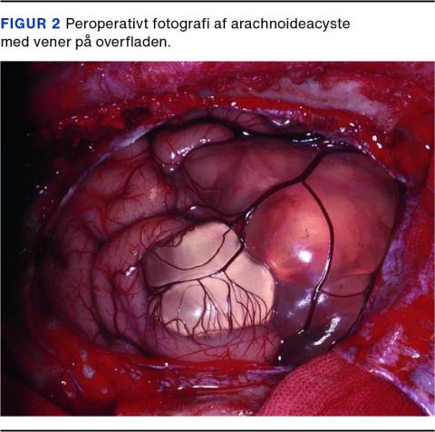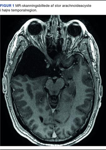 Arachnoideacyster (Figur 1 og Figur 2) er hyppige tilfældige fund på hjerneskanninger med en prævalens på 2% i befolkningen [1]. De betragtes som kongenitte strukturer, som udgår fra arachnoidea mater, den midterste hjernehinde, og indeholder cerebrospinalvæske. De kan opstå overalt, hvor der findes arachnoidea, inklusive i spinalkanalen. De intrakranielle arachnoideacyster ses oftest i fossa cranii media (55%), hvor de typisk er placeret mellem cerebrum og kraniet [1]. De findes her lidt hyppigere i venstre end i højre hemisfære, og blandt patienterne ses en lille overvægt af mænd [2].