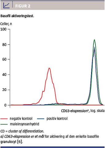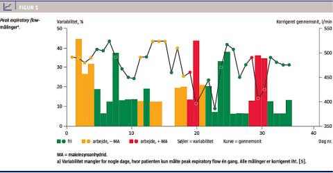 regelmæssig rundering og prøvetagning fra produktionsanlægget og i forbindelse med påfyldning af MA til systemet 1-2 gange dagligt, hvor han kortvarigt blev eksponeret for gasformig MA i forbindelse med til- og frakobling af slanger til procesanlægget. Åndedrætsværn (filtermaske) var til rådighed, men blev kun benyttet lejlighedsvist. Første gang patienten arbejdede med MA efter en sommerferie, faldt hans peak flow fra 550 l/min til 350 l/min. En fornyet peak expiratory flow (PEF)-monitorering i fem uger viste en tydeligt større variabilitet på arbejdsdage (23%) end på fridage (15%) og endnu større variabilitet på dage med eksponering for MA (28%) (Figur 1). Priktest for ti standardinhalationsantigener og priktest for ukonjungeret MA (fortynding 1:1.000, 1:100 og 1:10) var negative. Spirometri med reversibilitetstest og metakolintest viste normal lungefunktion uden tegn på reversibilitet, og røntgenoptagelser af thorax viste normale forhold. Men der fandtes stærkt positiv basofilaktiveringstest for MA (Figur 2) samt en forhøjet MA-specifik IgE (Thermo-Fischer) på 19,4 kE/l, hvilket tydede på en IgE-medieret allergisk reaktion over for MA. Da disse undersøgelser blev foretaget, var patienten ikke i behandling for sin astma.