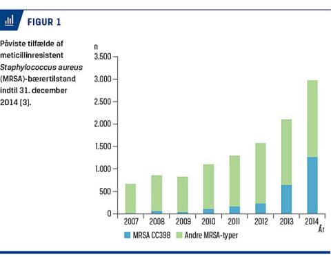 Meticillinresistent Staphylococcus aureus (MRSA) CC398 koloniserer primært svin. Personer, der færdes i svinestalde, vides at løbe en risiko for at blive koloniseret. I litteraturen er der flere dokumenterede eksempler på transmission mellem mennesker, men risikoen for dette er stærkt omdiskuteret [1, 2]. Der er sket en langsom stigning i antallet af tilfælde med andre MRSA-isolater fra mennesker i Danmark, mens antallet af MRSA CC398 stiger kraftigere (Figur 1). MRSA CC398 udgjorde i 2014 43% af det totale antal MRSA-isolater. Smitten sker stadig primært fra svin til mennesker, idet 89% af de smittede enten havde kontakt med svin