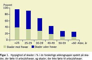 Hvis man deler de tilskadekomne i to grupper efter alder, hhv. 17-29 år og 30-65 år er der forskel på ulykkeshyppigheden, hos gruppen under 30 år var hyppigheden på 53,8% (95% CI 44,1-64,9), mod 40,6% (95% CI 34,7-47,2) hos gruppen over 30 år, både hvad angår antallet af skader pr. person og skader uden fravær. Gennemsnitsfraværet på grund af arbejdsulykker var på 7,28 dage (1-120 dage). Der var gennemsnitlig 5,14 dages (1-50) fravær i gruppen under 30 år og 8,46 (1-120) i gruppen på 30 år og derover.